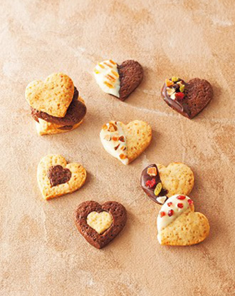 - 〈型で抜いて焼く〉冷蔵庫から出した生地に打ち粉を少しして綿棒で3mmの厚さにのばし、ハートの型で抜きます。160度に温めたオーブンで16分焼きます。ツートンの場合は、ハート型で抜いたプレーン生地、ココア生地の中央をさらに小さいハート型で抜き、抜いた生地を互いに入れ替え、それぞれの抜きあとに埋め込みます。